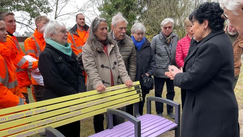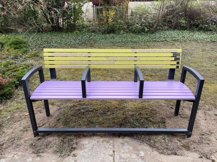 Die Bank in lila und gelb ist speziell für Senioren gut geeignet, da sie höher ist als üblich und mehrere Armlehnen zum besseren Aufstehen besitzt. Auf der Rückenlehne kann man einige Sprüche gegen die Einsamkeit lesen, z.B. "Gemeinsam reden wir mehr", "Gespräche schaffen Gemeinschaft" oder "Plaudern macht glücklich".