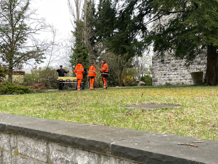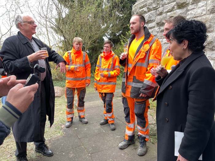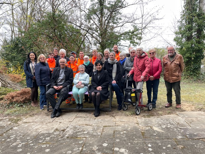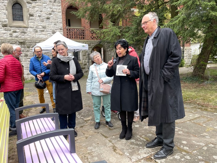 Eine kleine Schar von Waidmannsluster Gemeindemitgliedern war zusammen mit Pfarrer Christoph Anders Zeuge der feierlichen Einweihung. Bei Sekt mit und ohne Alkohol wurde darauf anstoßen. Anschließend probierten alle die neue Quasselbank aus und genossen die Gespräche auf ihr.