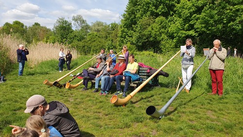 Auf dem Weg: Musik mit den Alphörnern von Alphorn Berlin e.V. am Hermsdorfer See, Nähe Freibad Lübars