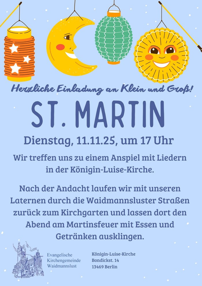 Wir treffen uns zu einem Anspiel zu St. Martin mit Liedern in der Königin-Luise-Kirche. Nach der Andacht laufen wir mit unseren Laternen durch die Waidmannsluster Straßen zurück zum Kirchgarten, um dort am Martinsfeuer mit Essen und Getränken den Abend ausklingen zu lassen.